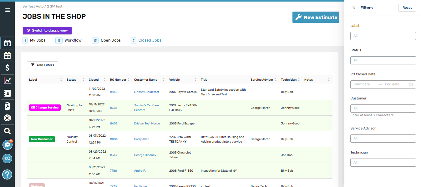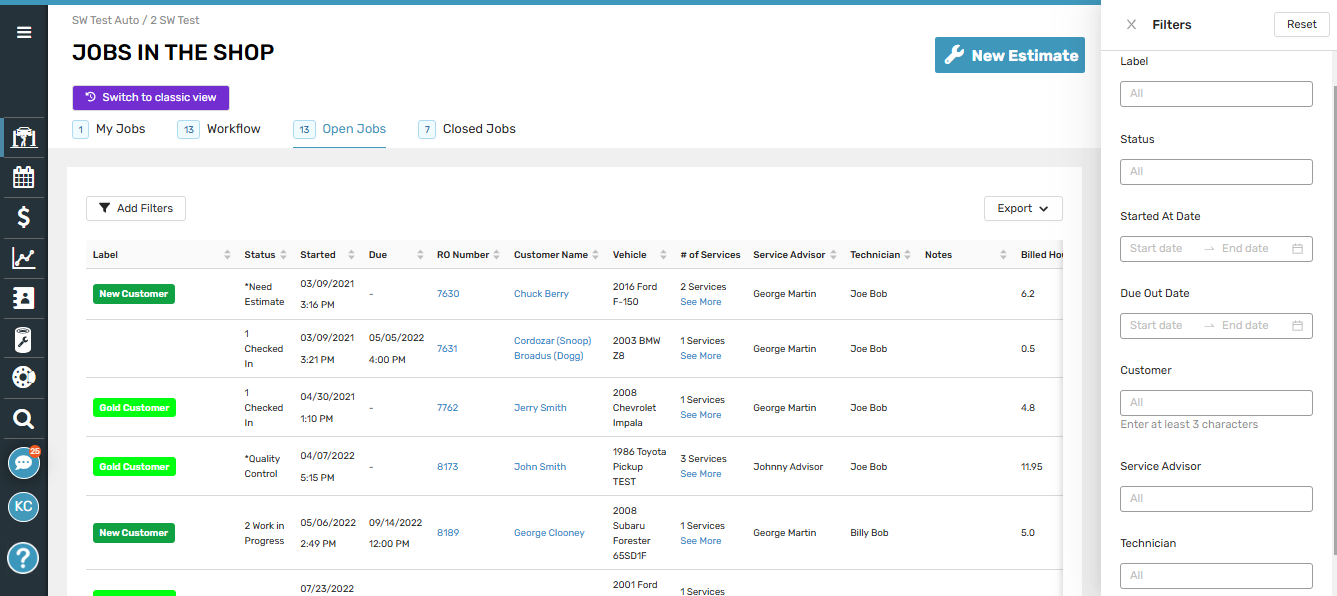 The Open and Closed Jobs pages have been redesigned to improve the user’s experience. Both pages are now updated live (within 5 seconds) as changes happen within your shop. You can sort across all items and filter columns. Open Jobs now has the ability to be exported.