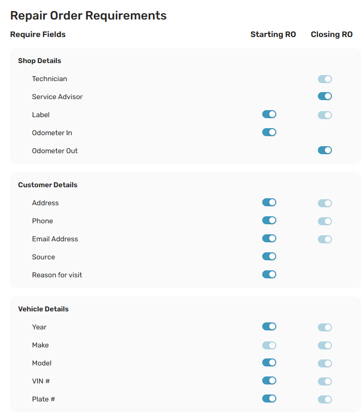 These requirement settings will determine what kind of information will be shown and requested when starting or closing a Repair Order. By default, you are unable to change whether or not a Technician or Make of a vehicle is required, they will always be required on ROs.