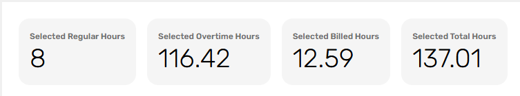 As you make selections—whether it's a single staff member or all— the four KPIs at the top of the Payroll page update in real time. These metrics instantly reflect the combined total of regular hours, overtime hours, billed hours, and overall hours for the selected staff.