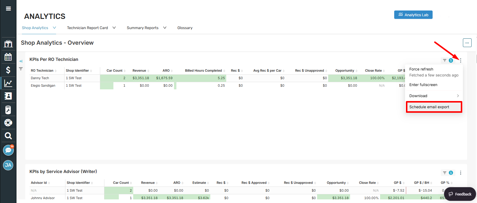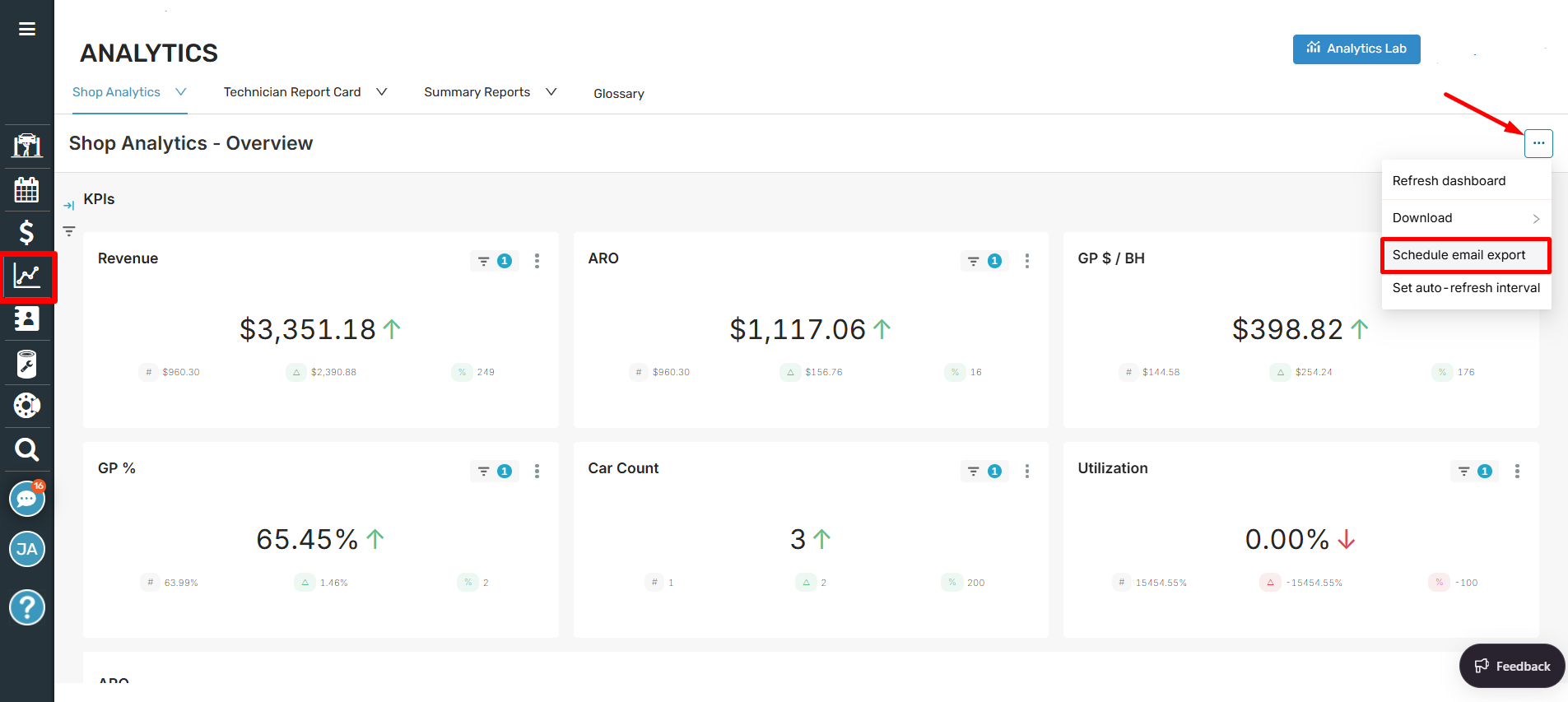 Similar to scheduling exports of dashboard in Analytics Lab, you can navigate to the new Analytics page in Shop Manager, find the dashboard you're wanting to schedule, and click the three dots in the upper right of the dashboard and choose to 'Schedule Email Export.'