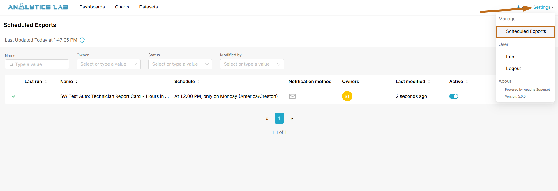 Once the scheduled email export is saved, you'll be able to see it and manage it under the Settings option in the upper right of Analytics Lab.